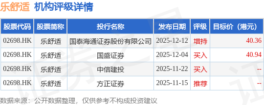 投行对该股的评级以买入为主,近90天内共有2家投行给出买入评级,近90天的目标均价为40.65港元。国泰海通证券股份有限公司最新一份研报给予乐舒适增持评级,目标价40.36港元。