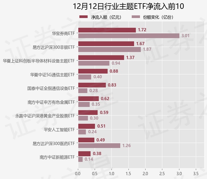 当日有58只行业主题ETF基金出现资金净流入,其中净流入排首位的是华宝券商ETF(512000),份额增加了3.01亿份,净流入额为1.72亿元。