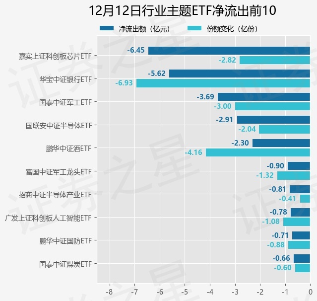 当日有128只行业主题ETF基金出现资金净流出,其中净流出排首位的是嘉实上证科创板芯片ETF(588200),份额减少了2.82亿份,净流出额为6.45亿元。