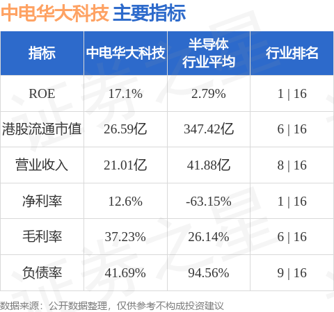 中电华大科技港股市值26.59亿港元,在半导体行业中排名第6。主要指标见下表: