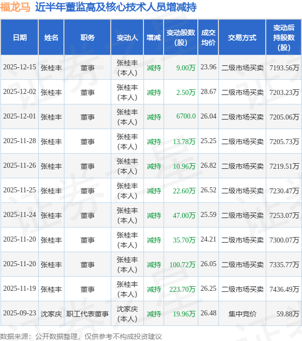福龙马近半年内的董监高及核心技术人员增减持详情如下: