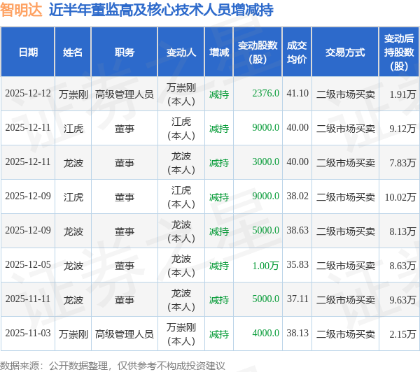 智明达近半年内的董监高及核心技术人员增减持详情如下: