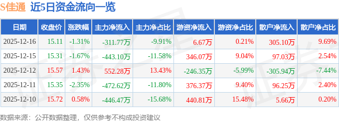 证券之星消息,截至2025年12月16日收盘,S佳通(600182)报收于15.11元,下跌1.31%,换手率1.22%,成交量2.08万手,成交额3147.51万元。