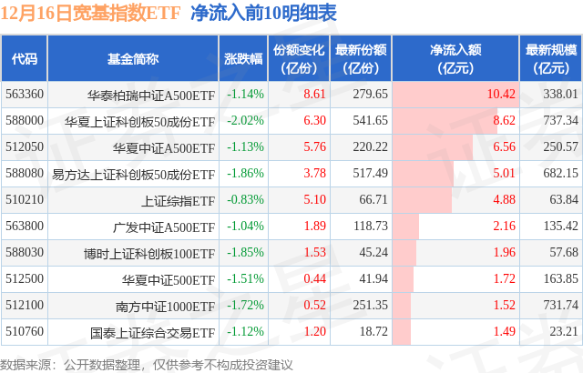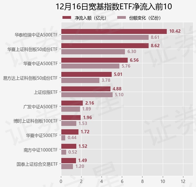 当日有59只宽基指数ETF基金出现资金净流入,其中净流入排首位的是华泰柏瑞中证A500ETF(563360),份额增加了8.61亿份,净流入额为10.42亿元。