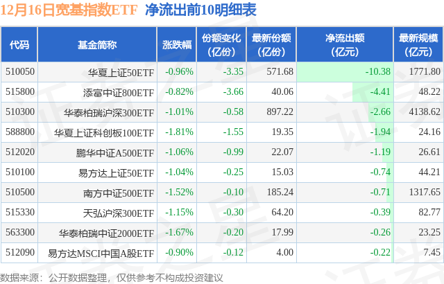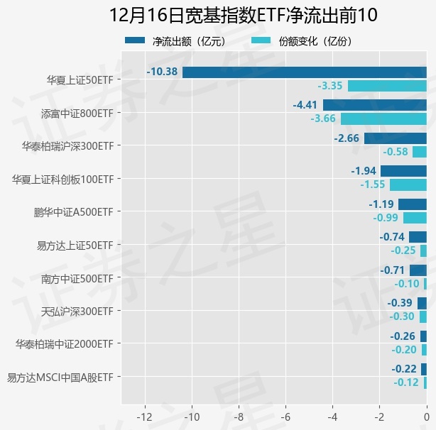 当日有35只宽基指数ETF基金出现资金净流出,其中净流出排首位的是华夏上证50ETF(510050),份额减少了3.35亿份,净流出额为10.38亿元。