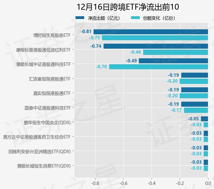 当日有15只跨境ETF基金出现资金净流出,其中净流出排首位的是博时恒生高股息ETF(513690),份额减少了7500.0万份,净流出额为8128.84万元。