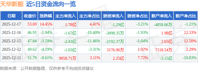 证券之星消息,截至2025年12月17日收盘,天华新能(300390)报收于53.69元,上涨14.45%,换手率11.47%,成交量77.12万手,成交额40.24亿元。