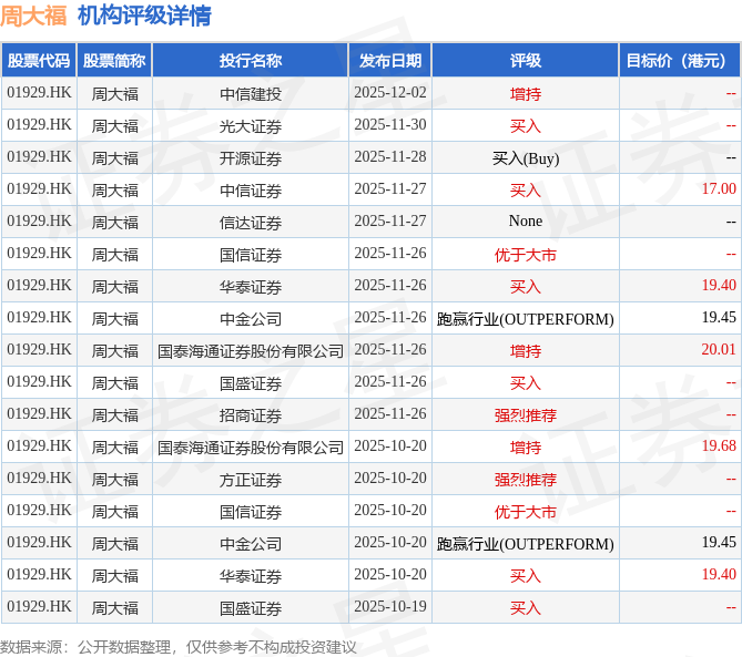 投行对该股的评级以买入为主,近90天内共有7家投行给出买入评级,近90天的目标均价为19.3港元。广发证券最新一份研报给予周大福买入评级,目标价19.99港元。