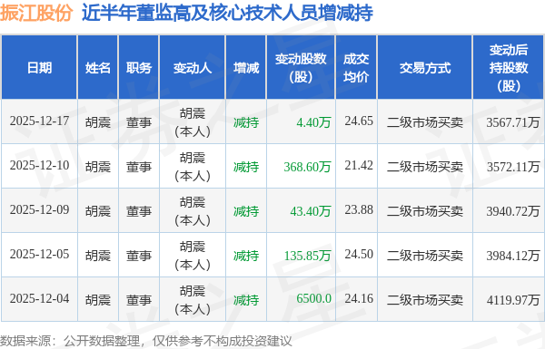 证券之星消息,根据12月18日市场公开信息、上市公司公告及交易所披露数据整理,振江股份(603507)最新董监高及相关人员股份变动情况:2025年12月17日公司董事胡震共减持公司股份4.4万股,占公司总股本为0.0239%。变动期间公司股价下跌0.36%,12月17日当日收盘报24.69元。