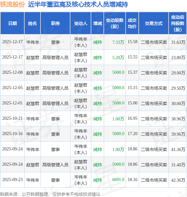铁流股份近半年内的董监高及核心技术人员增减持详情如下: