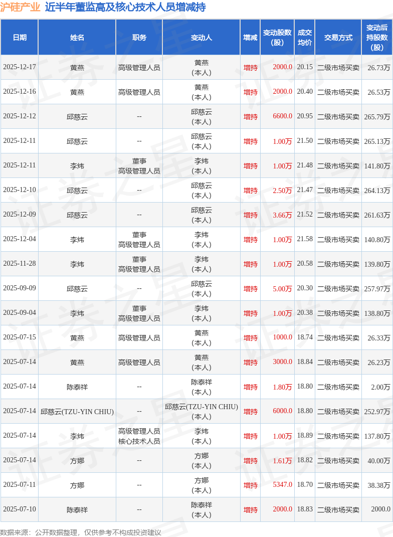 沪硅产业近半年内的董监高及核心技术人员增减持详情如下: