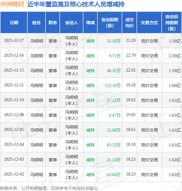 证券之星消息,根据12月18日市场公开信息、上市公司公告及交易所披露数据整理,中洲特材(300963)最新董监高及相关人员股份变动情况:2025年12月17日公司董事冯明明共减持公司股份32.1万股,占公司总股本为0.07%。变动期间公司股价上涨0.65%,12月17日当日收盘报21.81元。