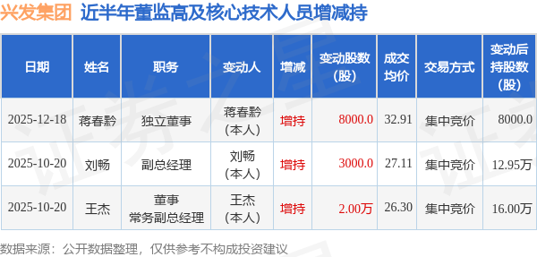 证券之星消息,根据12月19日市场公开信息、上市公司公告及交易所披露数据整理,兴发集团(600141)最新董监高及相关人员股份变动情况:2025年12月18日公司独立董事蒋春黔共增持公司股份8000.0股,占公司总股本为0.0007%。变动期间公司股价上涨1.96%,12月18日当日收盘报32.78元。