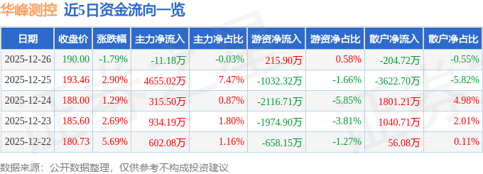 证券之星消息,截至2025年12月26日收盘,华峰测控(688200)报收于190.0元,下跌1.79%,换手率1.43%,成交量1.94万手,成交额3.71亿元。