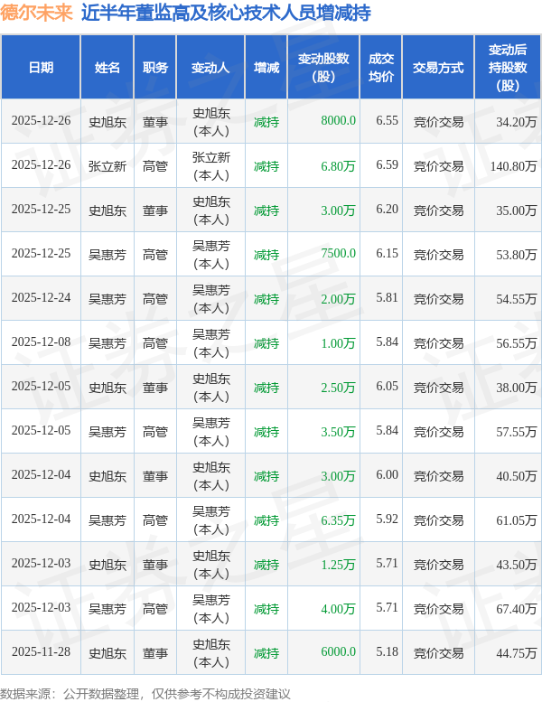 德尔未来近半年内的董监高及核心技术人员增减持详情如下: