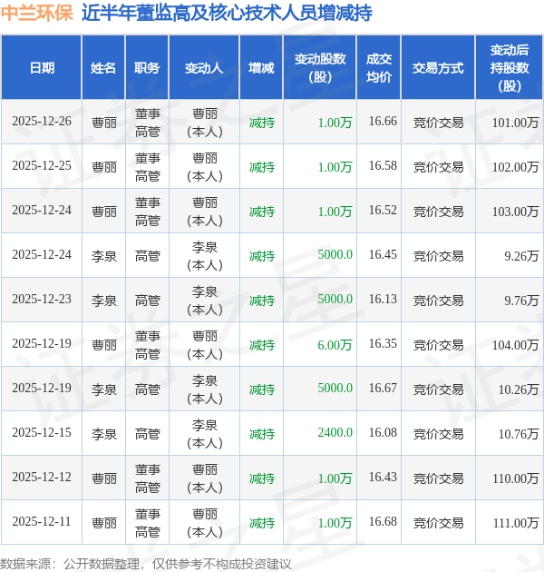 证券之星消息,根据12月29日市场公开信息、上市公司公告及交易所披露数据整理,中兰环保(300854)最新董监高及相关人员股份变动情况:2025年12月26日公司董事,高管曹丽共减持公司股份1.0万股,占公司总股本为0.01%。变动期间公司股价下跌0.42%,12月26日当日收盘报16.55元。