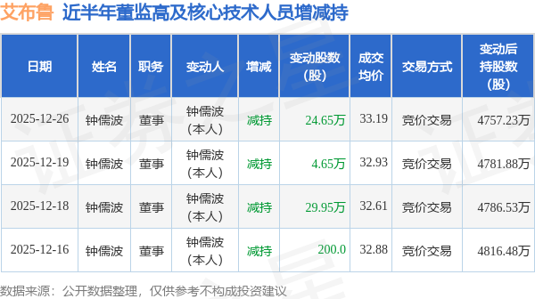 艾布鲁近半年内的董监高及核心技术人员增减持详情如下: