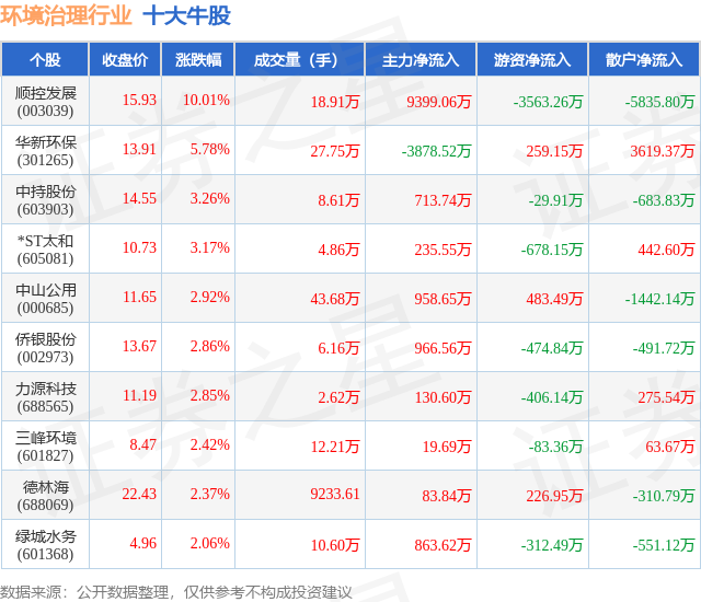个股表现方面,环境治理行业当日领涨股为顺控发展(003039),该股当日报收15.93,上涨10.01%,成交量18.91万,主力资金净流入9399.06万元。华新环保(301265)以上涨5.78%紧随其后,该股当日成交量27.75万,主力资金净流出3878.52万元。除此之外,中持股份(603903)、*ST太和(605081)、中山公用(000685)均进入当日牛股之列。具体个股列表见下表:
