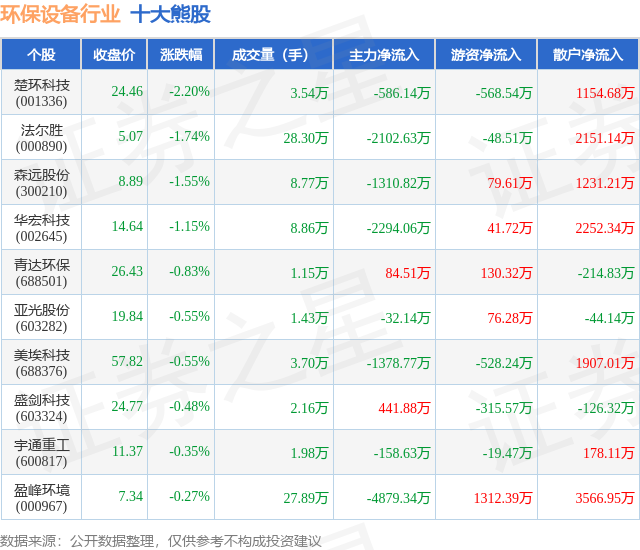 个股表现方面,环保设备行业当日领跌股为楚环科技(001336),该股当日报收24.46,下跌2.2%,成交量3.54万,主力资金净流出586.14万元。法尔胜(000890)以下跌1.74%紧随其后,该股当日成交量28.3万,主力资金净流出2102.63万元。除此之外,森远股份(300210)、华宏科技(002645)、青达环保(688501)均进入当日熊股之列。具体个股列表见下表: