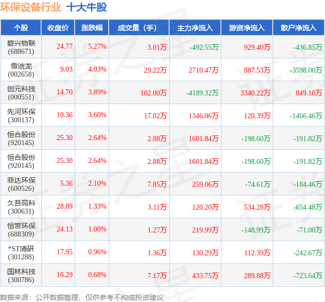 个股表现方面,环保设备行业当日领涨股为碧兴物联(688671),该股当日报收24.77,上涨5.27%,成交量3.01万,主力资金净流出492.55万元。雪迪龙(002658)以上涨4.03%紧随其后,该股当日成交量29.22万,主力资金净流入2710.47万元。除此之外,创元科技(000551)、先河环保(300137)、恒合股份(920145)均进入当日牛股之列。具体个股列表见下表: