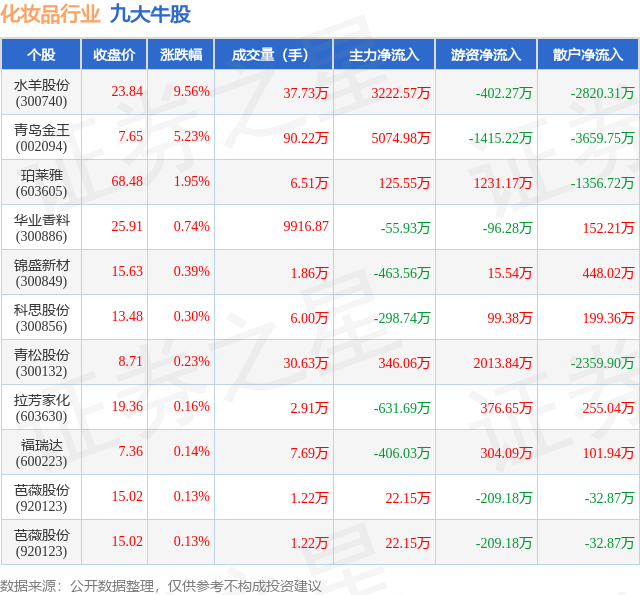个股表现方面,化妆品行业当日领涨股为水羊股份(300740),该股当日报收23.84,上涨9.56%,成交量37.73万,主力资金净流入3222.57万元。青岛金王(002094)以上涨5.23%紧随其后,该股当日成交量90.22万,主力资金净流入5074.98万元。除此之外,珀莱雅(603605)、华业香料(300886)、锦盛新材(300849)均进入当日牛股之列。具体个股列表见下表: