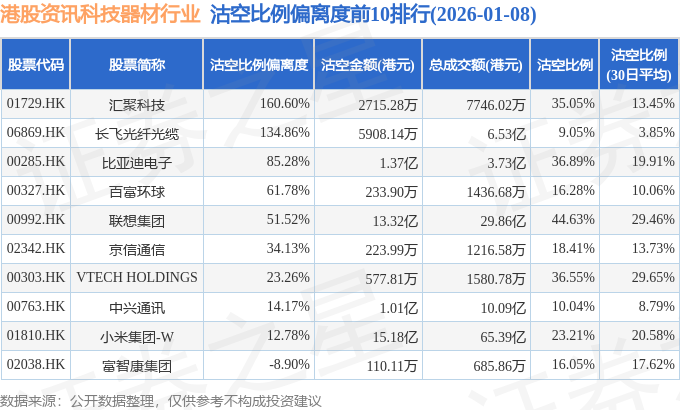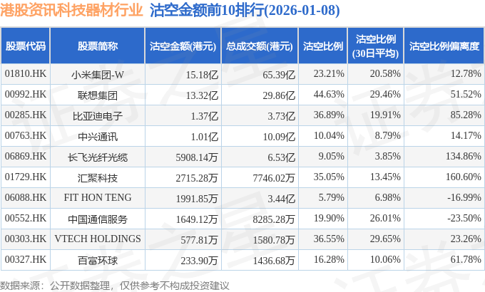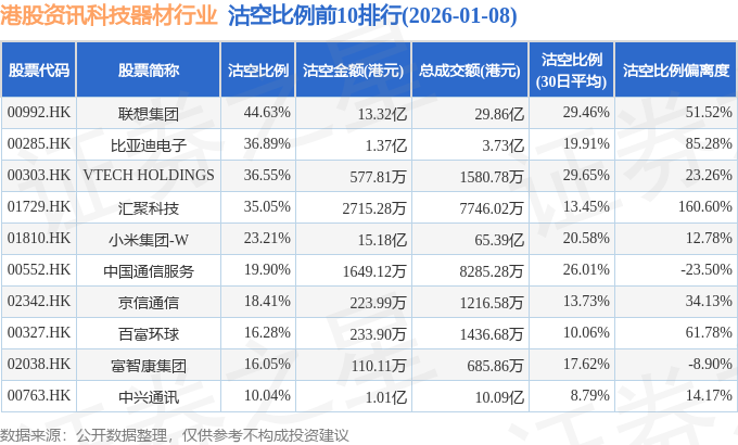 从沽空比例来看,联想集团、比亚迪电子、VTECH HOLDINGS沽空比例位居行业前三,分别为44.63%、36.89%、36.55%。