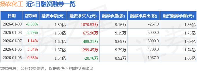 扬农化工融资融券信息显示,融资方面,当日融资买入2280.8万元,融资偿还1210.27万元,融资净买入1070.53万元。融券方面,融券卖出8200.0股,融券偿还8467.0股,融券余量9.16万股,融券余额646.06万元。融资融券余额1.86亿元。