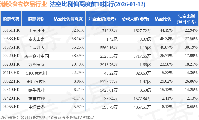 从沽空比例偏离度来看,中国旺旺、农夫山泉、百威亚太沽空比例偏离度位居行业前三,分别为92.61%、68.14%、55.25%。