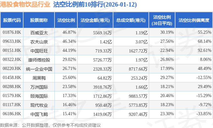 从沽空比例来看,百威亚太、农夫山泉、中国旺旺沽空比例位居行业前三,分别为46.87%、46.34%、44.19%。