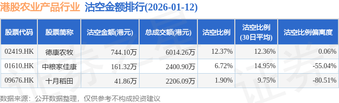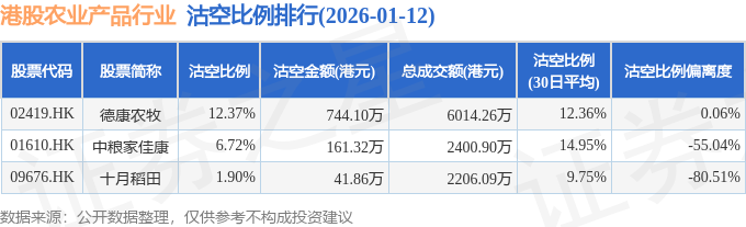 证券之星消息,1月12日港交所披露数据显示,当日港股农业产品行业的21只个股中有3只被沽空,总沽空股数为115.44万股,总沽空金额为947.28万元(港元),而当日农业产品行业的总成交金额为1.1亿元(港元),沽空比例为8.59%。当日农业产品行业总体涨1.24%。