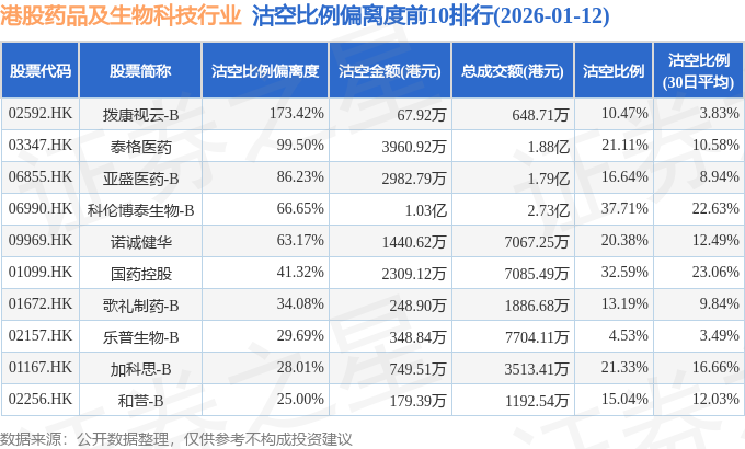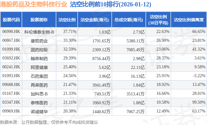 证券之星消息,1月12日港交所披露数据显示,当日港股药品及生物科技行业的162只个股中有82只被沽空,总沽空股数为2.13亿股,总沽空金额为29.88亿元(港元),而当日药品及生物科技行业的总成交金额为206.74亿元(港元),沽空比例为14.45%。当日药品及生物科技行业总体涨1.3%。