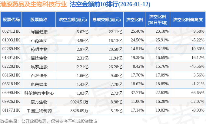 从沽空金额来看,阿里健康、石药集团、药明生物沽空金额位居行业前三,分别为5.62亿港元、3.96亿港元、2.97亿港元。