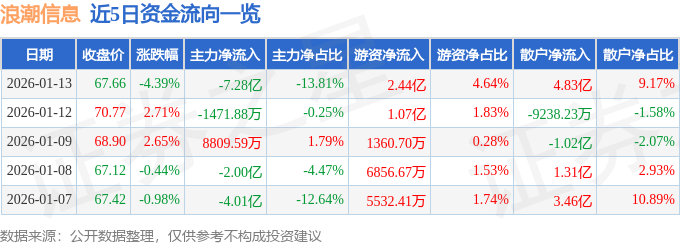 证券之星消息,截至2026年1月13日收盘,浪潮信息(000977)报收于67.66元,下跌4.39%,换手率5.2%,成交量76.31万手,成交额52.7亿元。