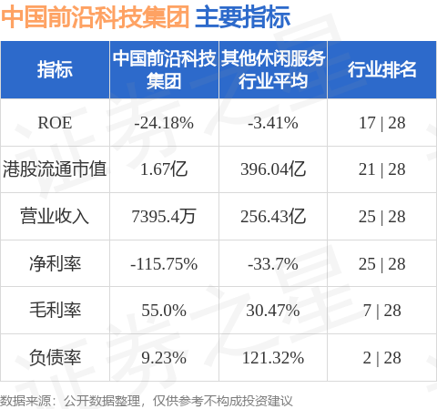 中国前沿科技集团港股市值1.67亿港元,在其他休闲服务行业中排名第21。主要指标见下表: