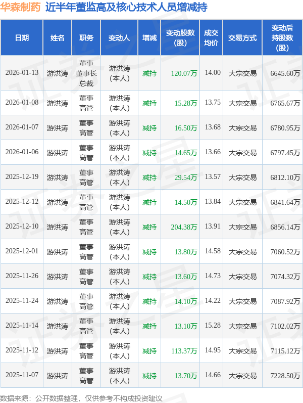 华森制药近半年内的董监高及核心技术人员增减持详情如下: