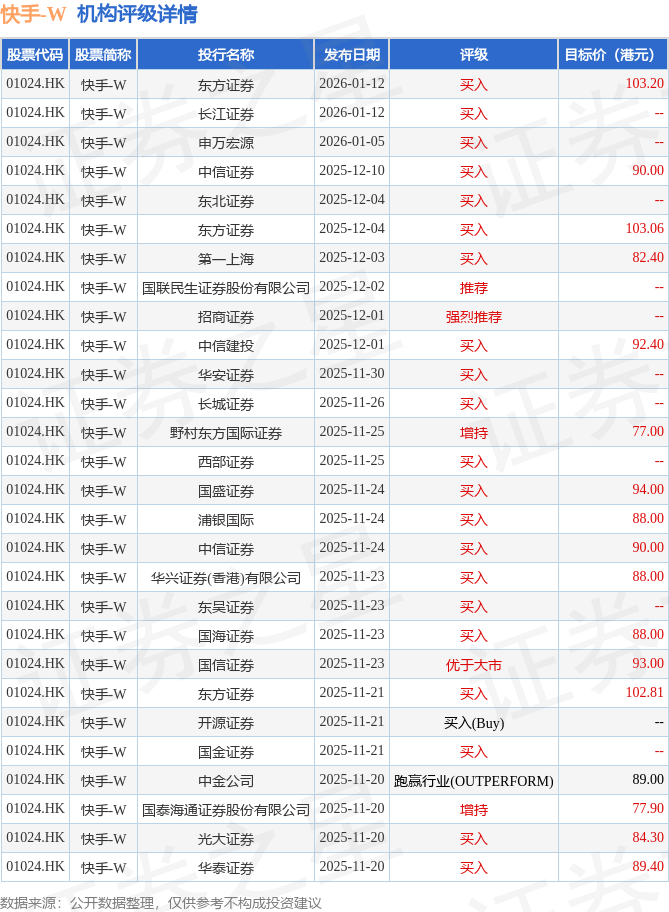 截至2026年1月13日收盘,快手-W(01024.HK)报收于78.45港元,下跌2.24%,成交量6444.31万股,成交额51.62亿港元。投行对该股的评级以买入为主,近90天内共有21家投行给出买入评级,近90天的目标均价为90.15港元。东方证券最新一份研报给予快手-W买入评级,目标价103.2港元。