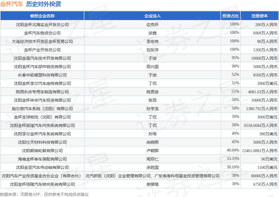 证券之星消息,根据天眼查APP显示,金杯汽车(600609.SH)新增一起对外投资事件,被投资公司为长春中拓模塑科技有限公司,法定代表人于波,投资占比为52%。该公司从事橡胶和塑料制品业,注册资本为8500万人民币。目前,金杯汽车共存在对外投资27项,投资占比前20的项目见下表:
