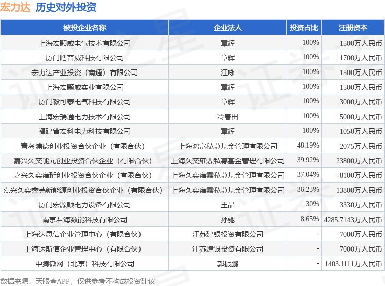 通过天眼查大数据分析,上海宏力达信息技术股份有限公司共对外投资了15家企业,参与招投标项目322次;财产线索方面有商标信息20条,专利信息268条,著作权信息82条;此外企业还拥有行政许可36个。据2024年报数据,宏力达长期股权投资5739.28万元。