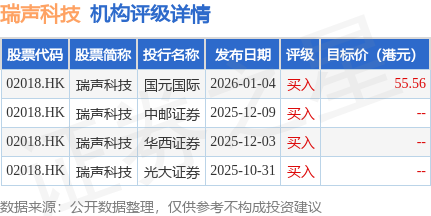 截至2026年1月14日收盘,瑞声科技(02018.HK)报收于39.0港元,下跌0.26%,成交量559.96万股,成交额2.2亿港元。投行对该股的评级以买入为主,近90天内共有4家投行给出买入评级,近90天的目标均价为55.56港元。国元国际最新一份研报给予瑞声科技买入评级,目标价55.56港元。