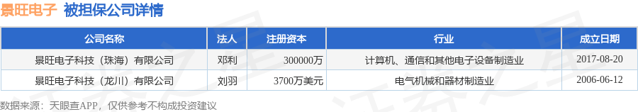 景旺电子1月13日披露2笔对外担保,被担保公司2家。对外担保明细如下表: