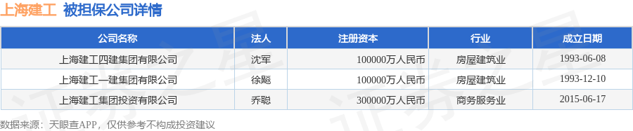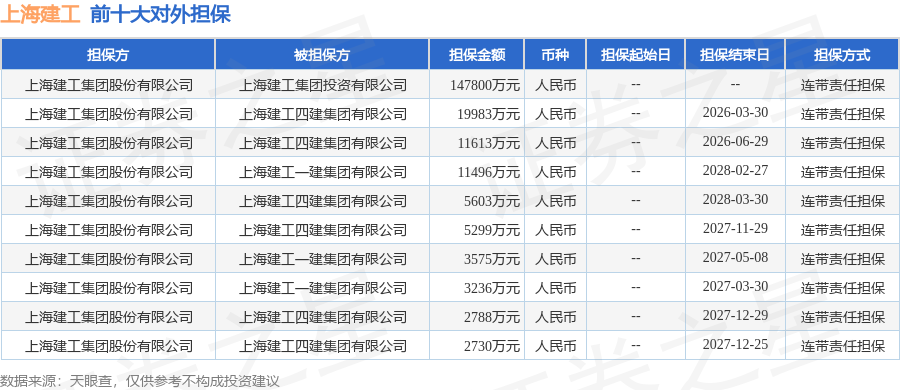 上海建工1月13日披露156笔对外担保,被担保公司18家。担保金额排在前十的对外担保明细如下表: