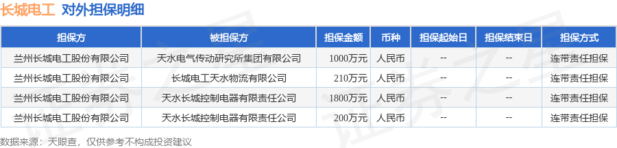 长城电工1月13日披露4笔对外担保,被担保公司3家。对外担保明细如下表: