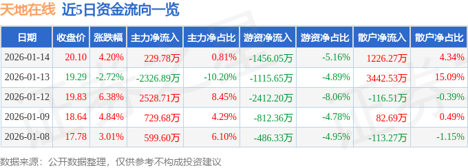 证券之星消息,截至2026年1月14日收盘,天地在线(002995)报收于20.1元,上涨4.2%,换手率12.6%,成交量14.16万手,成交额2.82亿元。