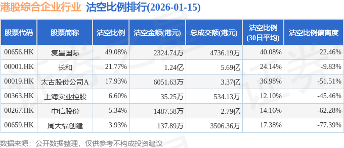 证券之星消息,1月15日港交所披露数据显示,当日港股综合企业行业的20只个股中有6只被沽空,总沽空股数为970.0万股,总沽空金额为2.24亿元(港元),而当日综合企业行业的总成交金额为12.97亿元(港元),沽空比例为17.28%。当日综合企业行业总体涨0.31%。