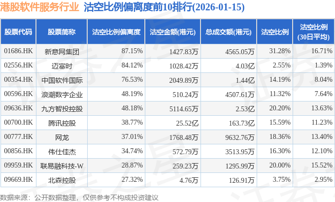 从沽空比例偏离度来看,新意网集团、迈富时、中国软件国际沽空比例偏离度位居行业前三,分别为87.15%、84.12%、76.53%。