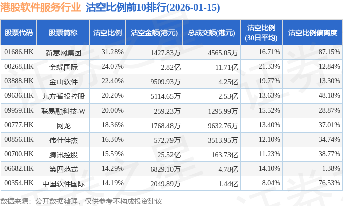 从沽空比例来看,新意网集团、金蝶国际、金山软件沽空比例位居行业前三,分别为31.28%、24.07%、22.4%。