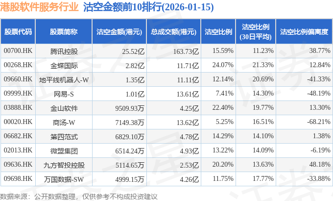 从沽空金额来看,腾讯控股、金蝶国际、地平线机器人-W沽空金额位居行业前三,分别为25.52亿港元、2.82亿港元、1.35亿港元。