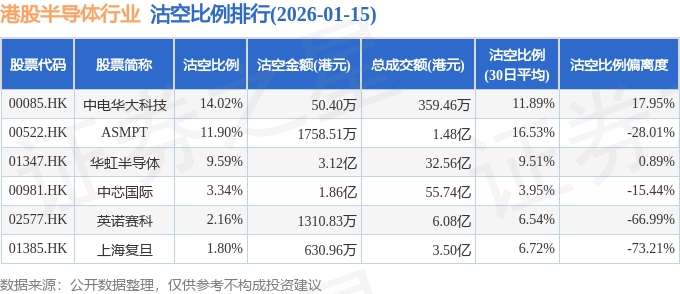 从沽空比例偏离度来看,中电华大科技、华虹半导体、中芯国际沽空比例偏离度位居行业前三,分别为17.95%、0.89%、-15.44%。