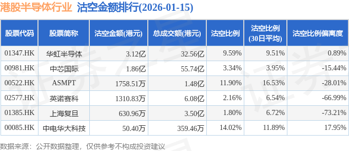 从沽空金额来看,华虹半导体、中芯国际、ASMPT沽空金额位居行业前三,分别为3.12亿港元、1.86亿港元、1758.51万港元。