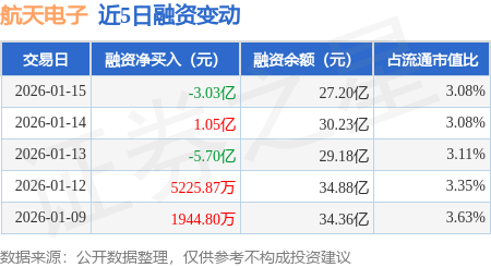 证券之星消息,1月15日,航天电子(600879)融资买入4.15亿元,融资偿还7.18亿元,融资净卖出3.03亿元,融资余额27.2亿元,近20个交易日中有11个交易日出现融资净买入。